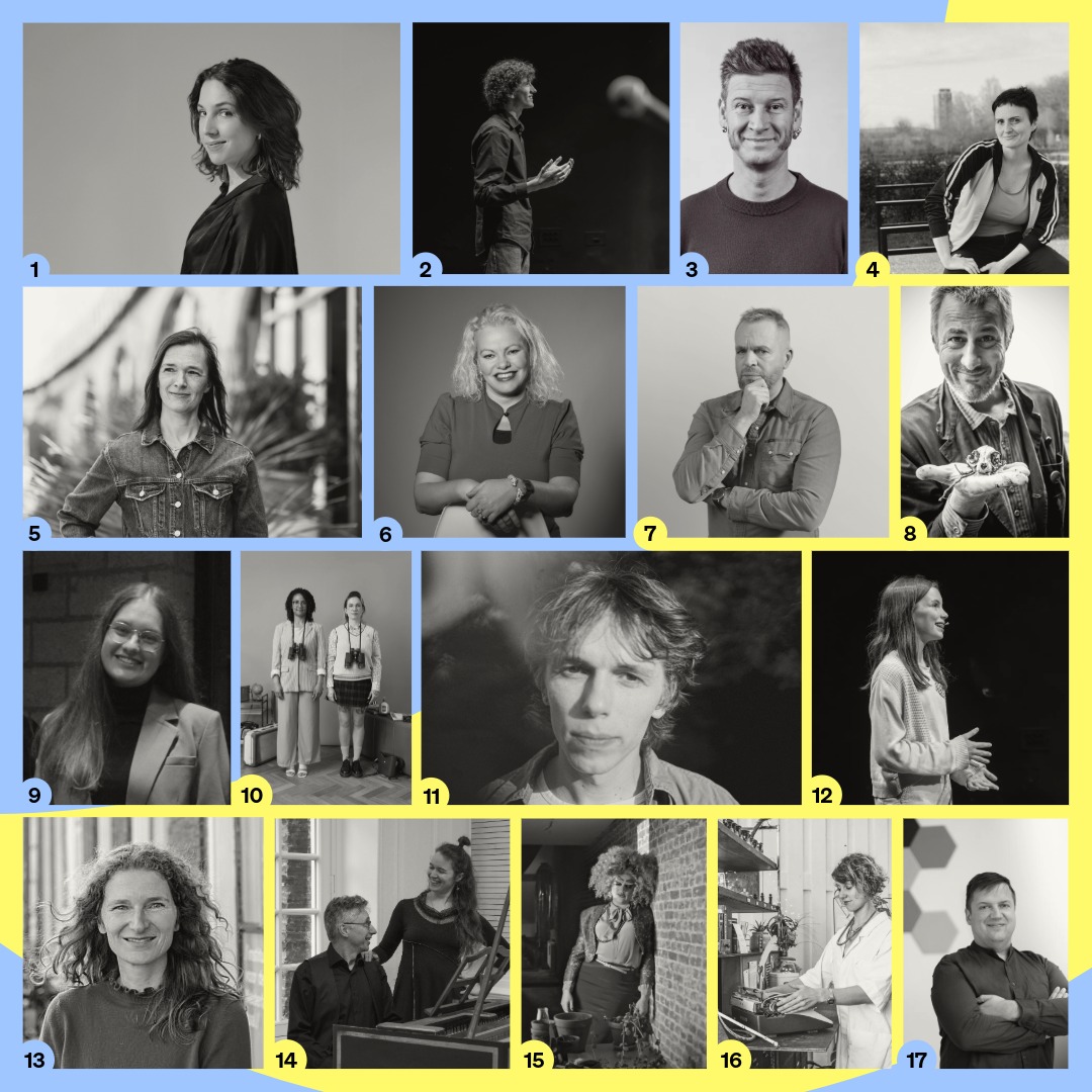 1. Michèle Cuvelier (© VRT) / 2. Cezar Vinckier (© Woord in Actie) / 3. Wouter Deprez (© Jonas Lampens) / 4. Nela Deleu Đenisijević / 5. Laura van Eerten (© Michelle Piergoelam) / 6. Vivien Waszink / 7. Lieven Vandenhaute (© VRT) / 8. broeder Dieleman / 9. Melissa Schuring / 10. Aafke Romeijn & Kelia Kaniki Masengo (© Mathias Hannes) / 11. Frans Kalf (© Liberty Corbett) / 12. Josefien Willaert (© Woord in Actie) / 13. Maaike Beliën / 14. Les Goûts-Authentiques / 15. Brenda W. Aerts / 16. de Typotheek / 17. Gunther Van Neste (© Isabelle Pateer)