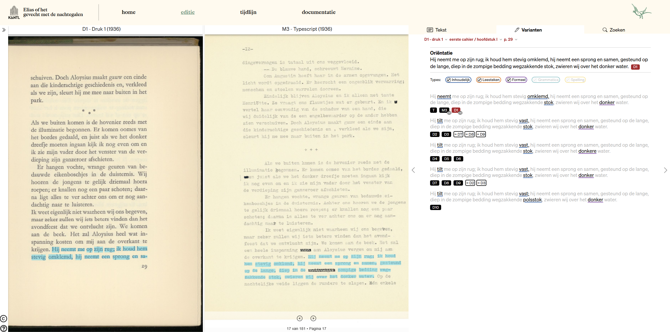 De Elias-varianteneditie is ontwikkeld door CTB, de afdeling voor digitale documentatie van de KANTL, die zich inzet voor het behoud en de promotie van het taalkundige en literaire erfgoed van de Nederlandssprekende wereld. We zijn trots op de realisatie van de digitale ontsluiting van Elias of het gevecht met de nachtegalen, waarmee je in Gilliams' meesterwerk kunt duiken op manieren die voorheen niet mogelijk waren. De online editie is een grondige herwerking van het elektronisch variantenapparaat dat deel uitmaakte van de historisch-kritische editie Geen woorden duren zoals het marmer van Liesbeth Van Melle (proefschrift UGent 2007; als boek verschenen bij de KANTL in 2015).