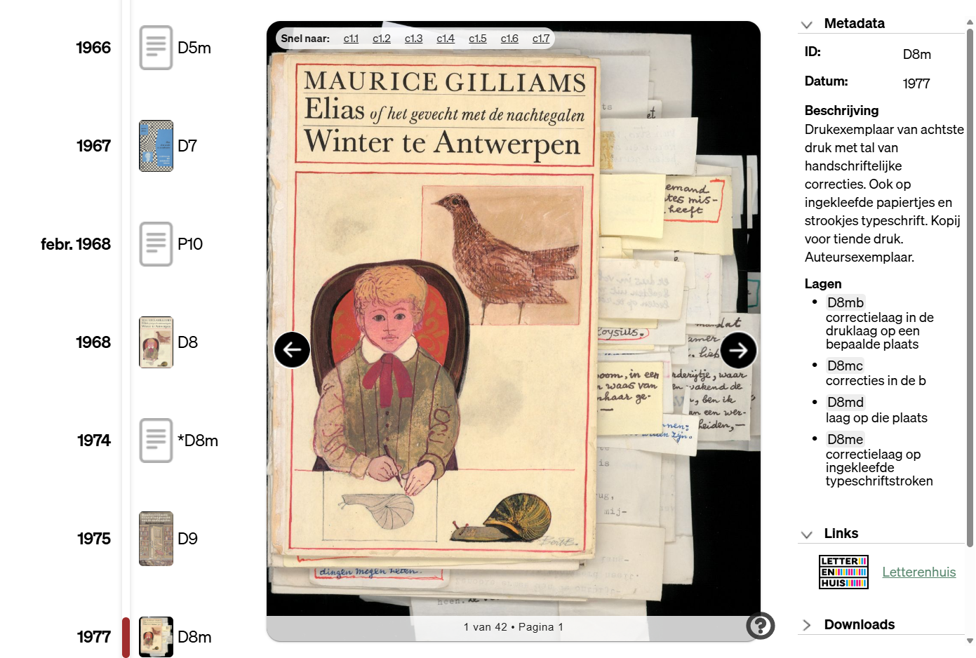 De webomgeving biedt, naast de editie met rechtstreeks vergelijkbare versies, ook een uitgebreide digitale facsimilebibliotheek aan. Ontdek via een tijdlijn 40 verschillende stadia die Gilliams' iconische roman heeft doorlopen. Je kan de facsimiles van 19 bronnen integraal doorbladeren, waaronder de 10 geautoriseerde drukken, het fragmentarische kladhandschrift met de eerste zinnen, het volledige kopijtyposcript voor de eerste druk, unieke vroege handschriften van het ‘tweede cahier’ en een aantal bijzondere kopijen voor latere drukken, met aantekeningen van de auteur.